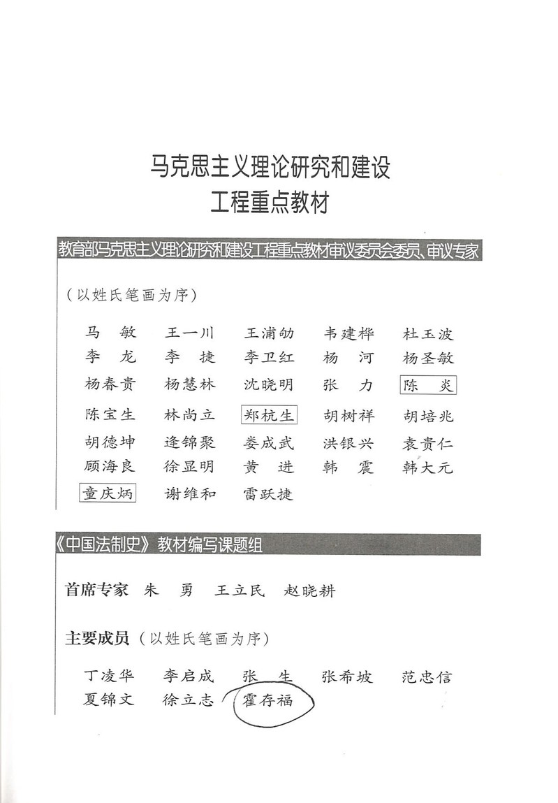 《中国法制史》教材是马克思主义理论研究和建设工程重点教材,星空官网法学院霍存福教授作为主要成员参与了该教材第五章的编写。“马工程”重点教材《中国法制史》是“教育部哲学社会科学研究重大课题攻关项目(马克思主义理论研究和建设工程重点教材编写专项)”的成果,由教育部组织编写,经国家教材委员会审查通过,于2017年出版。这本《中国法制史》教材除绪论外,共19章内容,内容涉及中国法律的起源与特点、夏商法制、社西周法制、春秋战国时期的法制、秦朝法制、汉朝法制、隋唐法制、明朝法制、清朝法制、民国时期法制、新民主主义革命时期的法制、中华人民共和国成立以来的法制、香港澳门特别行政区法制等内容,并在第2版将习近平新时代中国特色社会主义思想以及教材出版以来中国国法制史领域的新理论等内容融入其中。
