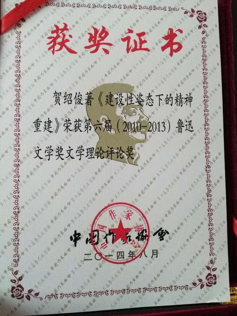 贺绍俊获鲁迅文学奖证书
